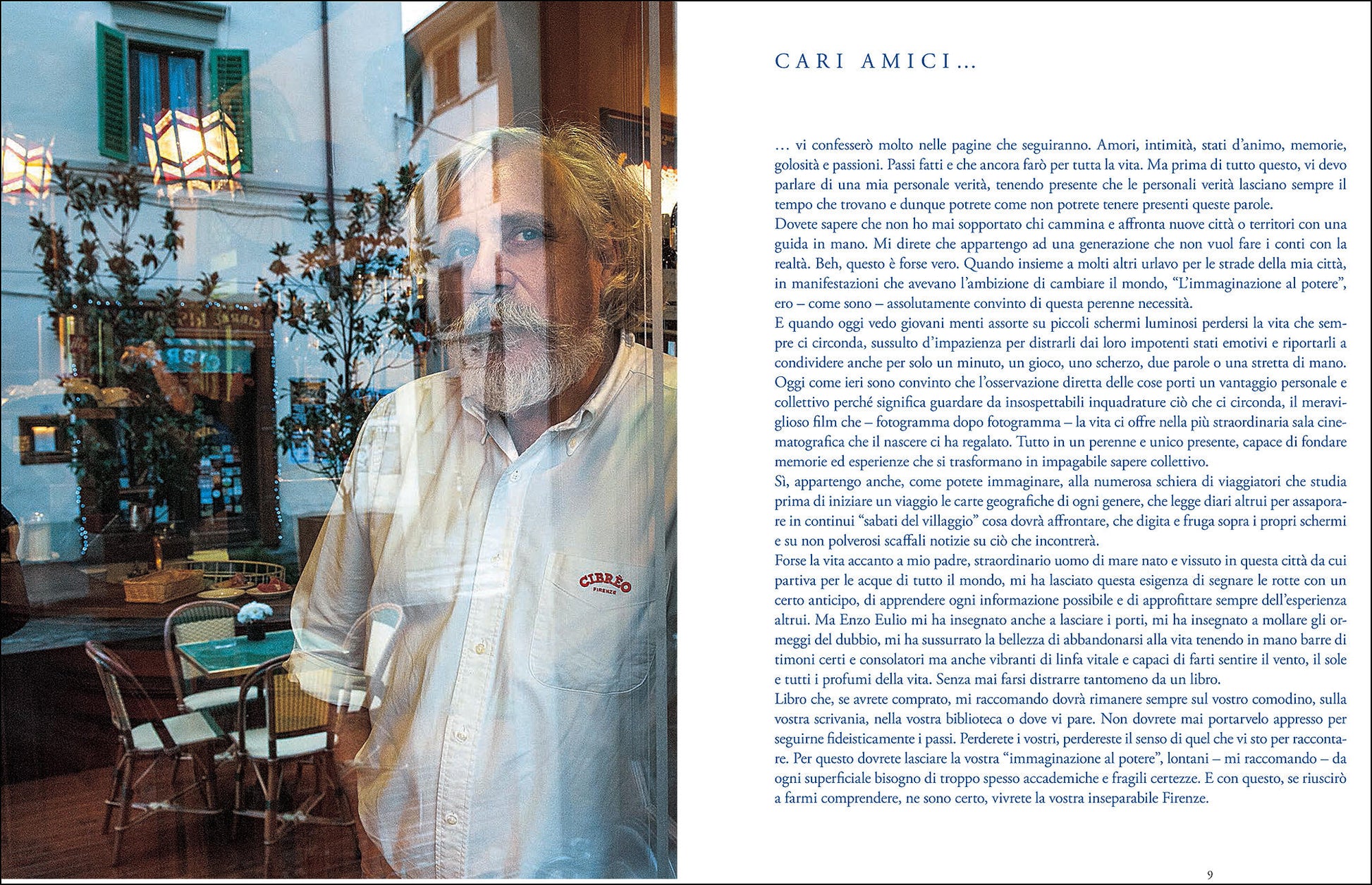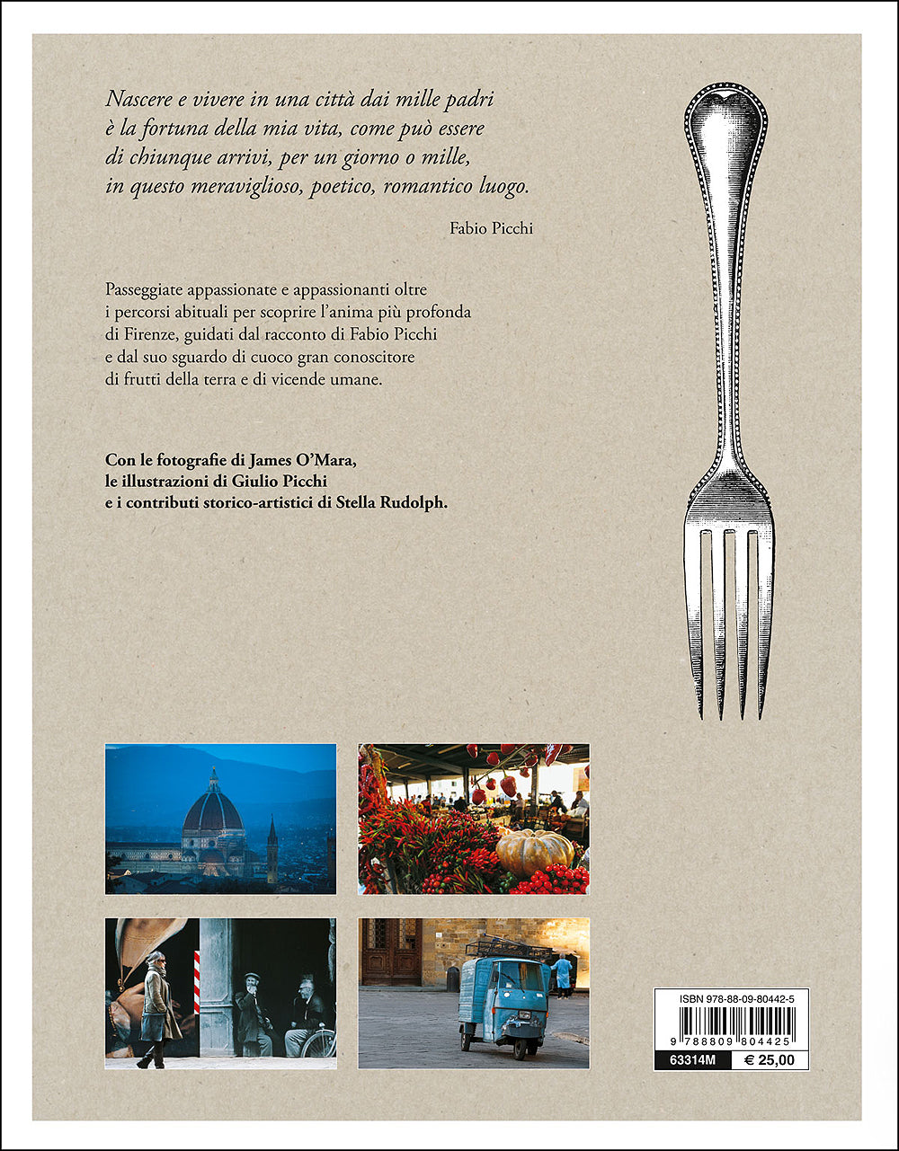 Firenze raccontata da Fabio Picchi, chef-filosofo, in un libro che è sì uno sguardo sulla sua cucina e sulla cucina toscana, una guida turistica e sentimentale dell'arte a Firenze, ma anche memoir, racconto... Picchi, qui cicerone d'eccezione, accompagna per la città i lettori in passeggiate appassionate e appassionanti scoprendo l'anima di locali, personaggi, negozietti, monumenti, piazze, musei, viuzze, civaini, trippai, caffè. Fuori dai circuiti turistici. Con il suo inconfondibile stile affabulatorio, l'autore presenta i 10 punti che rendono Firenze irresistibile per un fiorentino e i 10 punti che la rendono irresistibile a chi fiorentino non è. Attraverso ricordi ed emozioni, spiega i tanti luoghi comuni sulla città, la visione del mondo dei suoi abitanti, narra di antiche botteghe e di personaggi che si possono incontrare ancora oggi. E da chef intreccia nella narrazione tante ricette suggerendo pause stagionali di gusto fra una passeggiata e l'altra e dedicando una sezione alle ricette fiorentine più legate alla tradizione. Scegliendo sempre di raccontare i piatti con il suo stile che rifugge dalla canonica e algida struttura ingredienti-tempi di cottura-preparazione. Ma questo libro è anche un racconto per immagini grazie alle splendide foto del canadese James O'Mara, amico di lunga data di Fabio Picchi, che segue l'autore nel suo girovagare ed è capace di vedere Firenze con i suoi occhi. Ad approfondire le tante opere d'arte che l'autore passa in rassegna nei suoi percorsi, numerosi interventi di Stella Rudolph, storica dell'arte di origine inglese da anni trapiantata a Firenze. Chi conosce Picchi sa che lo aspetta un fiume in piena, chi non lo conosce se ne innamorerà!