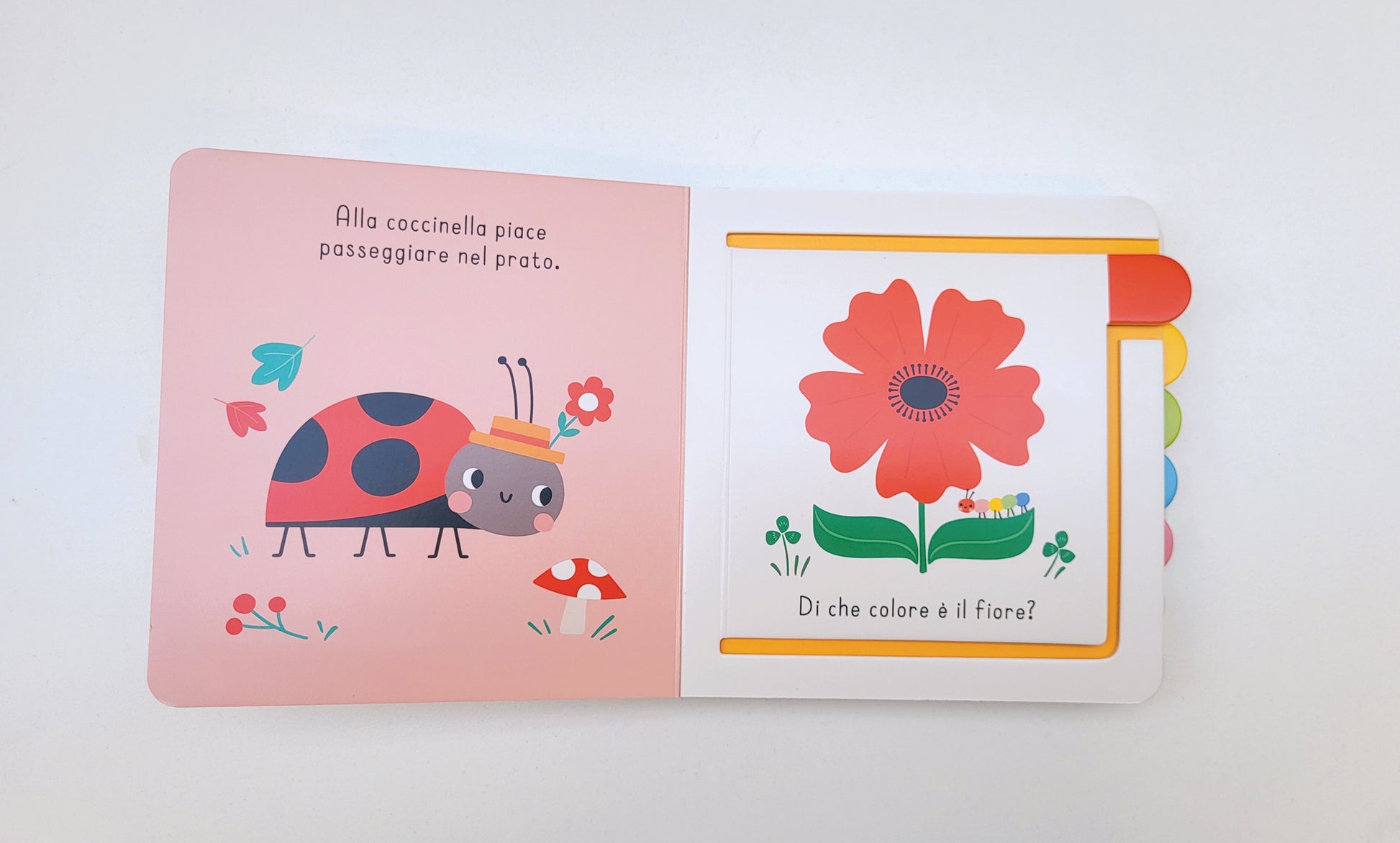 In ogni apertura di questo cartonato dalle pagine resistenti, dedicato ai colori, i piccolissimi potranno sollevare la finestrella nella pagina di destra per scoprire cosa nasconde, stimolando la percezione tattile e quella visiva e imparando le prime parole.