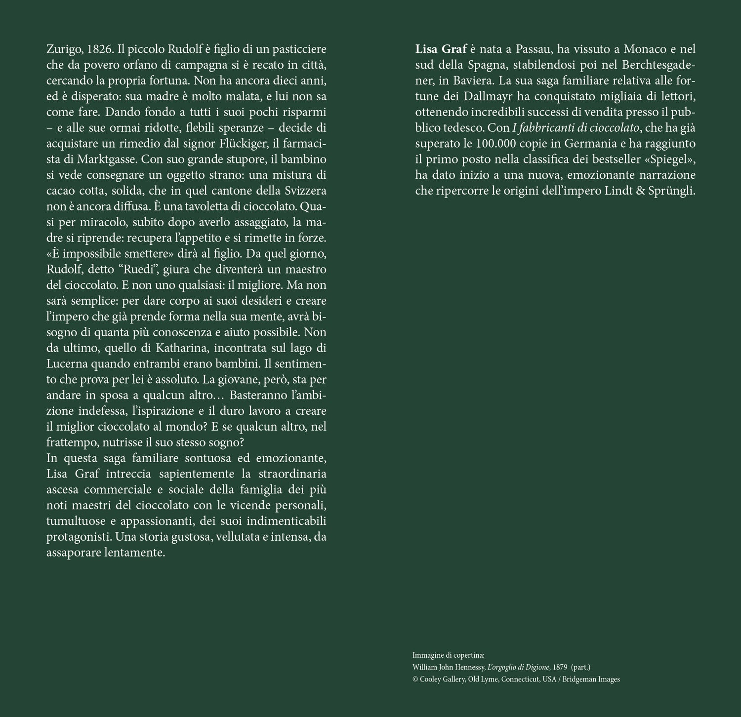 In questa saga familiare sontuosa ed emozionante, Lisa Graf intreccia sapientemente la straordinaria ascesa commerciale e sociale della famiglia dei più noti maestri del cioccolato con le vicende personali, tumultuose e appassionanti, dei suoi indimenticabili protagonisti. Una storia gustosa, vellutata e intensa, da assaporare lentamente.