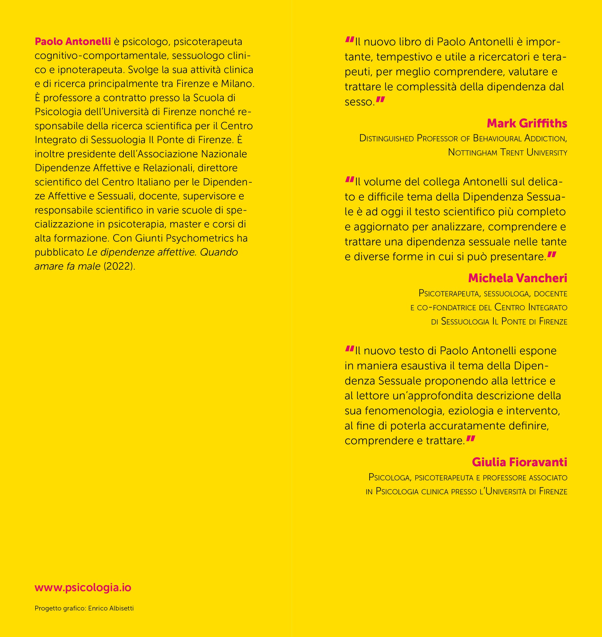 La dipendenza sessuale. Diagnosi, eziologia e trattamento è un testo unico nel suo genere che, in maniera aggiornata e completa, affronta una tematica molto attuale, complessa e articolata come quella della Dipendenza Sessuale, descrivendone nel dettaglio le peculiarità cliniche, i criteri diagnostici, l’inquadramento e la valutazione psicodiagnostica, i modelli eziopatogenetici e infine il trattamento, a cui segue l’analisi di un caso clinico.