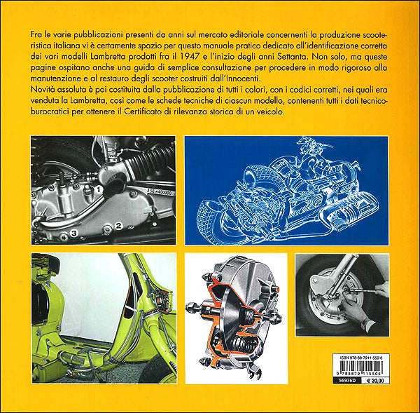 Prezioso volume per identificare e mantenere in perfetta efficienza la propria Lambretta, questa guida contiene tutte le informazioni raccolte dall'autore in oltre vent'anni di attività nel settore della manutenzione e della ricambistica. Per ogni modello sono proposti unascheda tecnica contenente i particolari di identificazione, uno schema con i dati per la verniciatura dei diversi componenti della carrozzeria, uno per le finiture delle parti metalliche e infine una sezione dedicata ai dati di manutenzione per motore e trasmissione. Corredato da numerose immagini e disegni tecnici, il volume, è un indispensabile strumento per tutti gli appassionati della Lambretta. Questa edizione ampliata riporta tutti i colori e gli abbinamenti di colore disponibili, negli anni, sui diversi modelli, per poi concludersi con le fiches di omologazione, documenti oggi indispensabili per poter iscrivere la propria Lambretta ai diversi club storici.