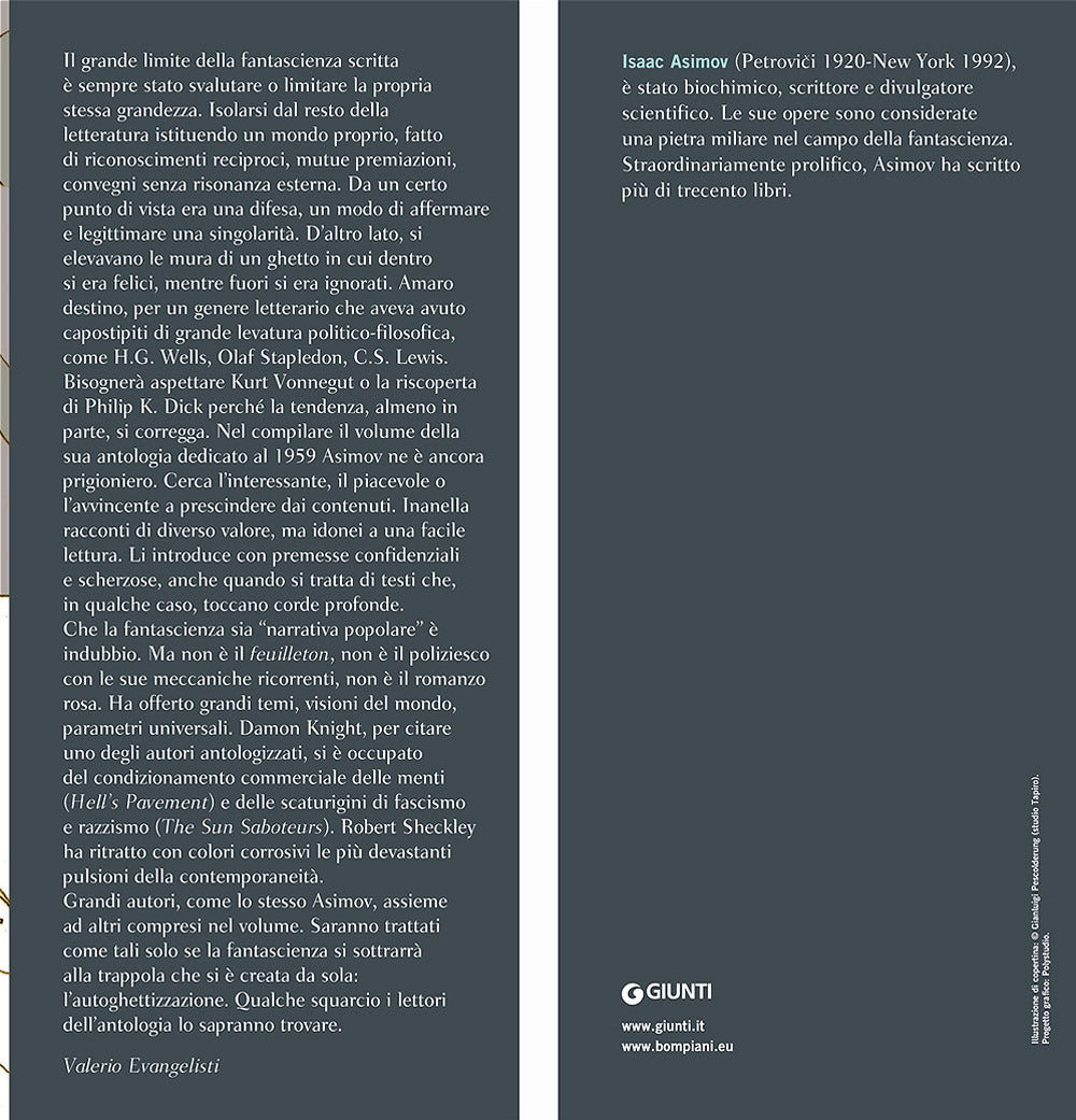 Il grande limite della fantascienza scritta è sempre stato svalutare o limitare la propria stessa grandezza. Isolarsi dal resto della letteratura istituendo un mondo proprio, fatto di riconoscimenti reciproci, mutue premiazioni, convegni senza risonanza esterna. Da un certo punto di vista era una difesa, un modo di affermare e legittimare una singolarità. D'altro lato, si elevavano le mura di un ghetto in cui dentro si era felici, mentre fuori si era ignorati. Amaro destino, per un genere letterario che aveva avuto capostipiti di grande levatura politico-filosofica, come H.G. Wells, Olaf Stapledon, C.S. Lewis. Bisognerà aspettare Kurt Vonnegut o la riscoperta di Philip K. Dick perché la tendenza, almeno in parte, si corregga. Nel compilare il volume della sua antologia dedicato al 1959 Asimov ne è ancora prigioniero. Cerca l'interessante, il piacevole o l'avvincente a prescindere dai contenuti. Inanella racconti di diverso valore, ma idonei a una facile lettura. Li introduce con premesse confidenziali e scherzose, anche quando si tratta di testi che, in qualche caso, toccano corde profonde. Che la fantascienza sia ''narrativa popolare'' è indubbio. Ma non è il feuilleton, non è il poliziesco con le sue meccaniche ricorrenti, non è il romanzo rosa. Ha offerto grandi temi, visioni del mondo, parametri universali. Damon Knight, per citare uno degli autori antologizzati, si è occupato del condizionamento commerciale delle menti (''Hell's Pavement'') e delle scaturigini di fascismo e razzismo (''The Sun Saboteurs''). Robert Sheckley ha ritratto con colori corrosivi le più devastanti pulsioni della contemporaneità. Grandi autori, come lo stesso Asimov, assieme ad altri compresi nel volume. Saranno trattati come tali solo se la fantascienza si sottrarrà alla trappola che si è creata da sola: l'autoghettizzazione. Qualche squarcio i lettori dell'antologia lo sapranno trovare. (Valerio Evangelisti) Titolo originale: ''Isaac Asimov Presents The Great Science Fiction Stories: 21'' (1959).
