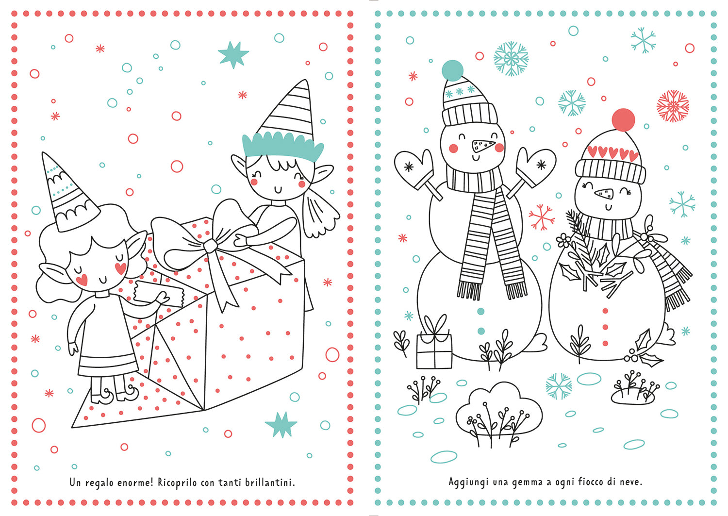 Un libro pieno di illustrazioni da colorare e decorare con tantissimi brillantini adesivi. Dagli splendidi alberi addobbati con tante lucine ai simpatici pupazzi di neve, sbizzarrisciti a creare opere d’arte scintillanti!