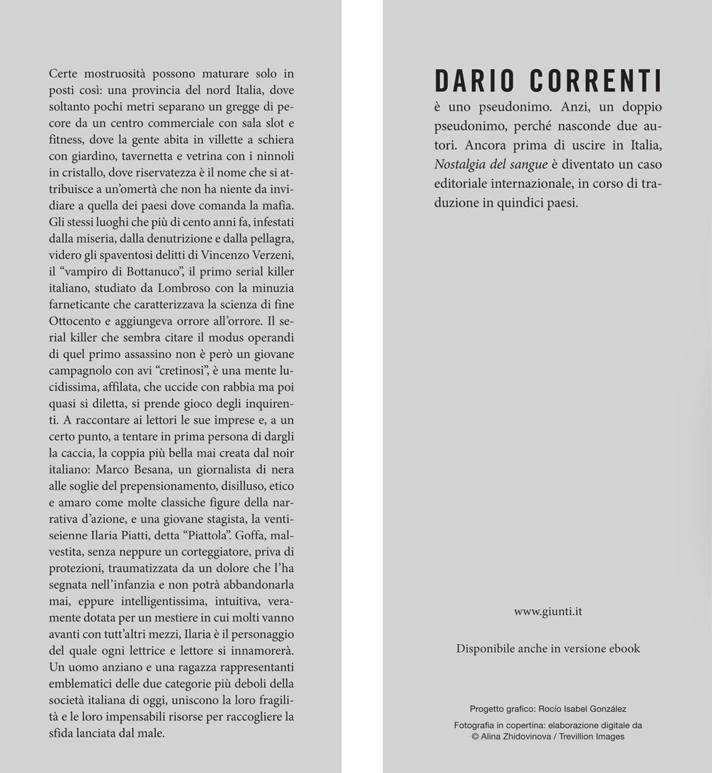 ''Nostalgia del Sangue'' di Dario Correnti è un noir italiano che vi terrà incollati alla pagina sia per la suspance che per i personaggi che lo abitano. Certe mostruosità possono maturare solo in posti così: una provincia del nord Italia, dove soltanto pochi metri separano un gregge di pecore da un centro commerciale con sala slot e fitness, dove la gente abita in villette a schiera con giardino, tavernetta e vetrina con i ninnoli in cristallo, dove riservatezza è il nome che si attribuisce a un'omertà che non ha niente da invidiare a quella dei paesi dove comanda la mafia. Gli stessi luoghi che più di cento anni fa, infestati dalla miseria, dalla denutrizione e dalla pellagra, videro gli spaventosi delitti di Vincenzo Verzeni, il ''vampiro di Bottanuco'', il primo serial killer italiano, studiato da Lombroso con la minuzia farneticante che caratterizzava la scienza di fine Ottocento e aggiungeva orrore all'orrore. Il serial killer che sembra citare il modus operandi di quel primo assassino non è però un giovane campagnolo con avi ''cretinosi'', è una mente lucidissima, affilata, che uccide con rabbia ma poi quasi si diletta, si prende gioco degli inquirenti. A raccontare ai lettori le sue imprese e, a un certo punto, a tentare in prima persona di dargli la caccia, la coppia più bella mai creata dal noir italiano: Marco Besana, un giornalista di nera alle soglie del prepensionamento, disilluso, etico e amaro come molte classiche figure della narrativa d'azione, e una giovane stagista, la ventiseienne Ilaria Piatti, detta ''Piattola''. Goffa, malvestita, senza neppure un corteggiatore, priva di protezioni, traumatizzata da un dolore che l'ha segnata nell'infanzia e non potrà abbandonarla mai, eppure intelligentissima, intuitiva, veramente dotata per un mestiere in cui molti vanno avanti con tutt'altri mezzi, Ilaria è il personaggio del quale ogni lettrice e lettore si innamorerà. Un uomo anziano e una ragazza rappresentanti emblematici delle due categorie più deboli della società italiana di oggi, uniscono la loro fragilità e le loro impensabili risorse per raccogliere la sfida lanciata dal male.