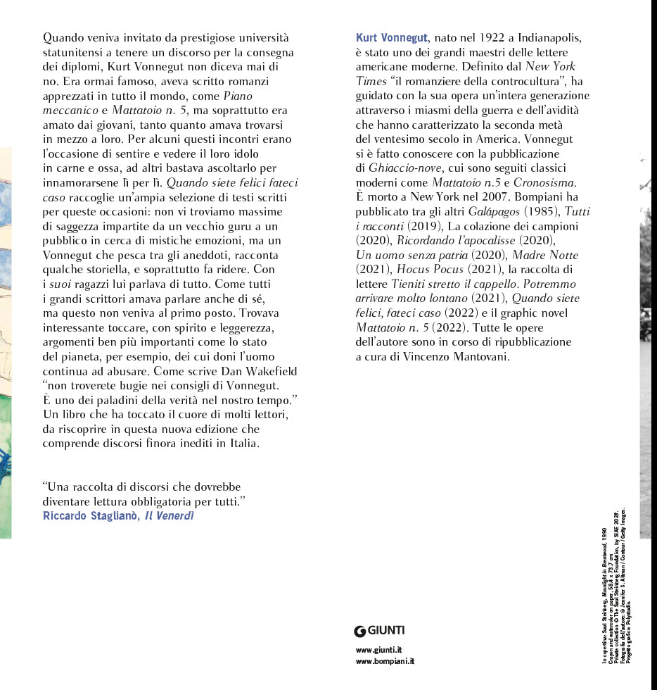 Quando veniva invitato da prestigiose università statunitensi a tenere un discorso per la consegna dei diplomi, Kurt Vonnegut non diceva mai di no. Era ormai famoso, aveva scritto romanzi apprezzati in tutto il mondo, come Piano meccanico e Mattatoio n. 5, ma soprattutto era amato dai giovani, tanto quanto amava trovarsi in mezzo a loro. Per alcuni questi incontri erano l’occasione di sentire e vedere il loro idolo in carne e ossa, ad altri bastava ascoltarlo per innamorarsene lì per lì. Quando siete felici, fateci caso raccoglie un’ampia selezione di testi scritti per queste occasioni: non vi troviamo massime di saggezza impartite da un vecchio guru a un pubblico in cerca di mistiche emozioni, ma un Vonnegut che pesca tra gli aneddoti, racconta qualche storiella, e soprattutto fa ridere. Con i suoi ragazzi lui parlava di tutto. Come tutti i grandi scrittori amava parlare anche di sé, ma questo non veniva al primo posto. Trovava interessante toccare, con spirito e leggerezza, argomenti ben più importanti come lo stato del pianeta, per esempio, dei cui doni l’uomo continua ad abusare. Come scrive Dan Wakefield “non troverete bugie nei consigli di Vonnegut. È uno dei paladini della verità nel nostro tempo.” Un libro che ha toccato il cuore di molti lettori, da riscoprire in questa nuova edizione che comprende discorsi finora inediti in Italia.