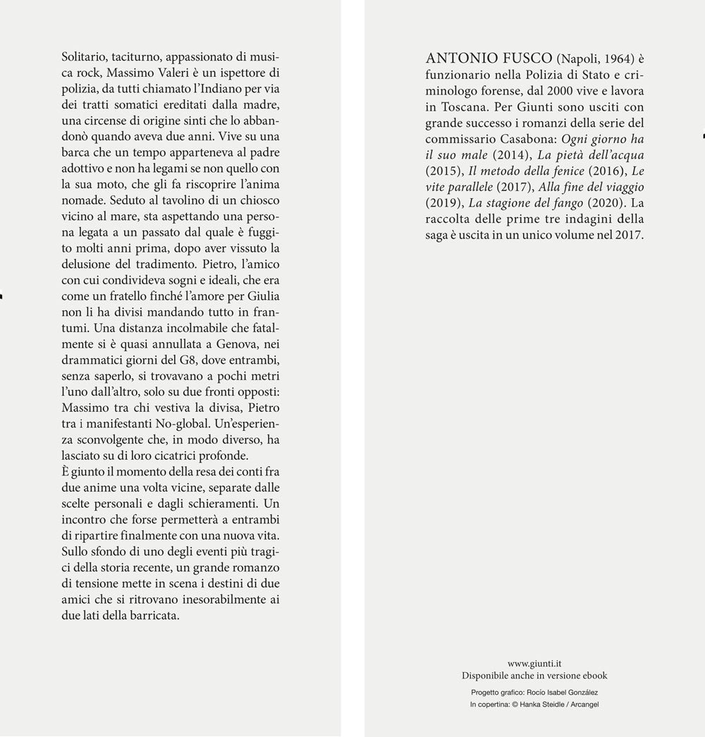 Solitario, taciturno, appassionato di musica rock, Massimo Valeri è un ispettore di polizia, da tutti chiamato l’Indiano per via dei tratti somatici ereditati dalla madre, una circense di origine sinti che lo abbandonò quando aveva due anni. Vive su una barca che un tempo apparteneva al padre adottivo e non ha legami se non quello con la sua moto, che gli fa riscoprire l’anima nomade. Seduto al tavolino di un chiosco vicino al mare, sta aspettando una persona legata a un passato dal quale è fuggito molti anni prima, dopo aver vissuto la delusione del tradimento. Pietro, l’amico con cui condivideva sogni e ideali, che era come un fratello finché l’amore per Giulia non li ha divisi mandando tutto in frantumi. Una distanza incolmabile che fatalmente si è quasi annullata a Genova, nei drammatici giorni del G8, dove entrambi, senza saperlo, si trovavano a pochi metri l’uno dall’altro, solo su due fronti opposti: Massimo tra chi vestiva la divisa, Pietro tra i manifestanti No-global. Un’esperienza sconvolgente che, in modo diverso, ha lasciato su di loro cicatrici profonde. È giunto il momento della resa dei conti fra due anime una volta vicine, separate dalle scelte personali e dagli schieramenti. Un incontro che forse permetterà a entrambi di ripartire finalmente con una nuova vita. Sullo sfondo di uno degli eventi più tragici della storia recente, un grande romanzo di tensione mette in scena i destini di due amici che si ritrovano inesorabilmente ai due lati della barricata.
