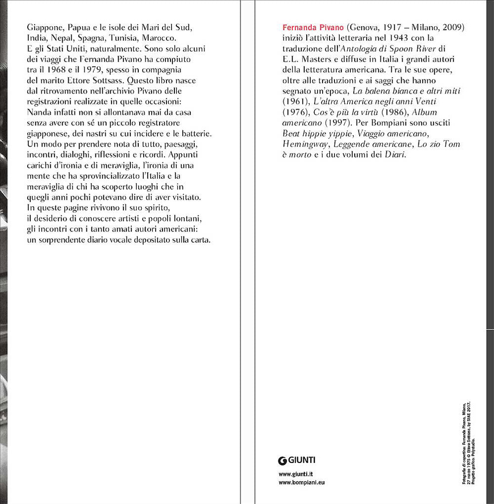Giappone, Papua e le isole dei Mari del Sud, India, Nepal, Spagna, Tunisia, Marocco. E gli Stati Uniti, naturalmente. Sono solo alcuni dei viaggi che Fernanda Pivano ha compiuto tra il 1968 e il 1979, spesso in compagnia del marito Ettore Sottsass. Questo libro nasce dal ritrovamento nell'archivio Pivano delle registrazioni realizzate in quelle occasioni: Nanda infatti non si allontanava mai da casa senza avere con sé un piccolo registratore giapponese, dei nastri su cui incidere e le batterie. Un modo per prendere nota di tutto, paesaggi, incontri, dialoghi, riflessioni e ricordi. Appunti carichi d'ironia e di meraviglia, l'ironia di una mente che ha sprovincializzato l'Italia e la meraviglia di chi ha scoperto luoghi che in quegli anni pochi potevano dire di aver visitato. In queste pagine rivivono il suo spirito, il desiderio di conoscere artisti e popoli lontani, gli incontri con i tanto amati autori americani: un sorprendente diario vocale depositato sulla carta.